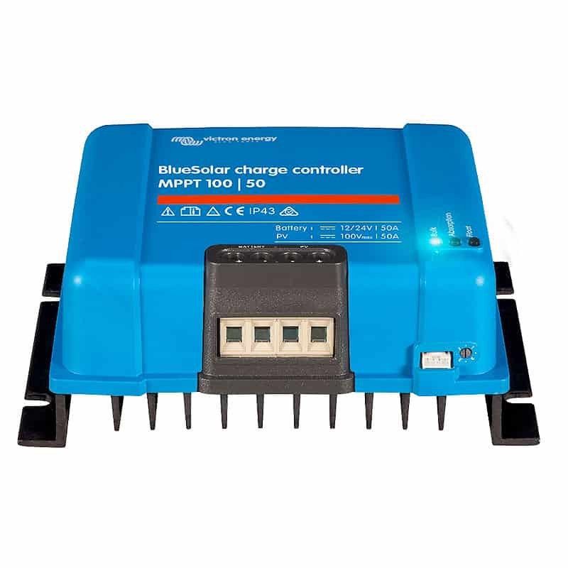 O controlador de carga solar Victron BlueSolar MPPT 100/50 é eficiente e utiliza um algoritmo de carga inteligente para otimizar o desempenho da bateria.